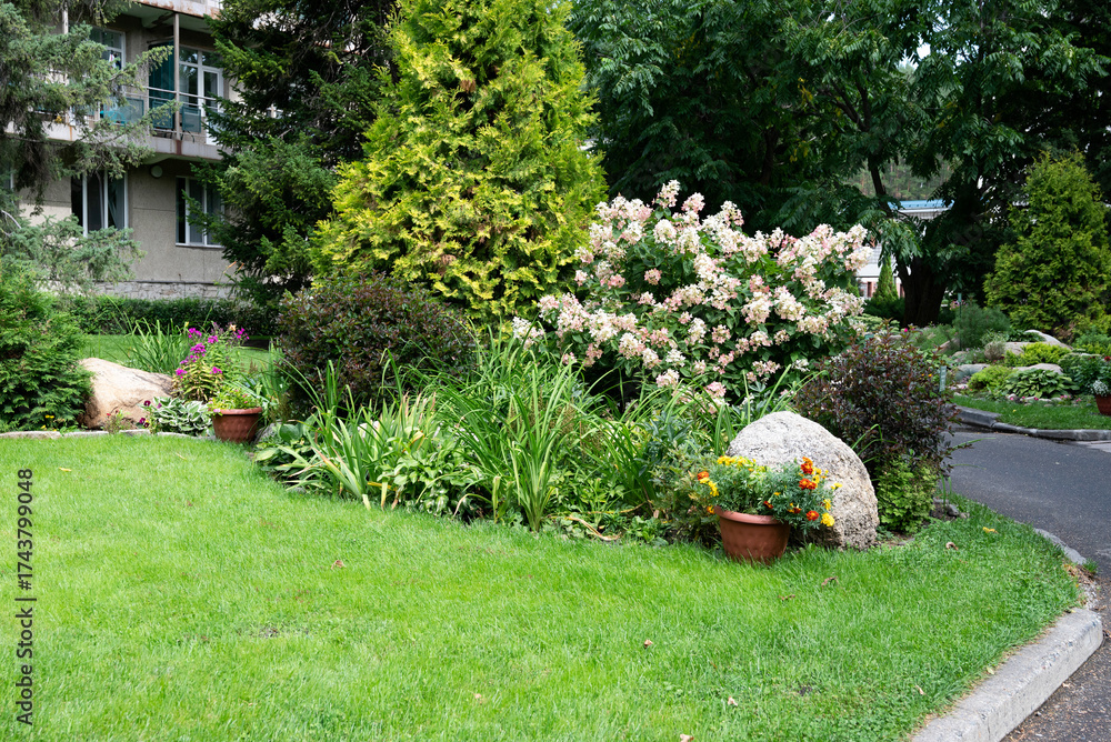 Scenic View of a Beautiful English Style Landscape Garden with a Green Mowed Lawn and Colourful Flower Bed