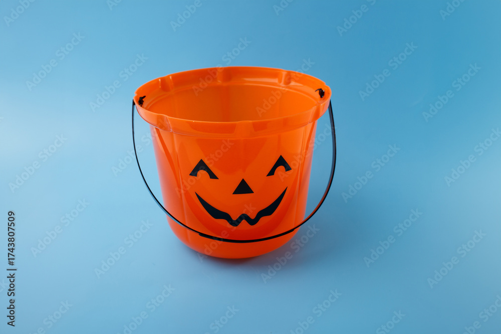 Bright orange jack-o-lantern candy bucket isolated on blue, perfect for e-commerce, toy stores, childrenbrands, seasonal ads, and Halloween-themed product listings