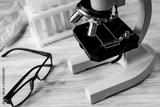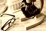 doctors desk with microscope and test tubes