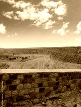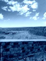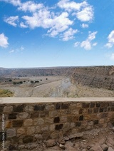 Landscape of the River between the Big White Hills on both sides under clear Blue Sky with White clouds. Trees and water in the peaceful valley