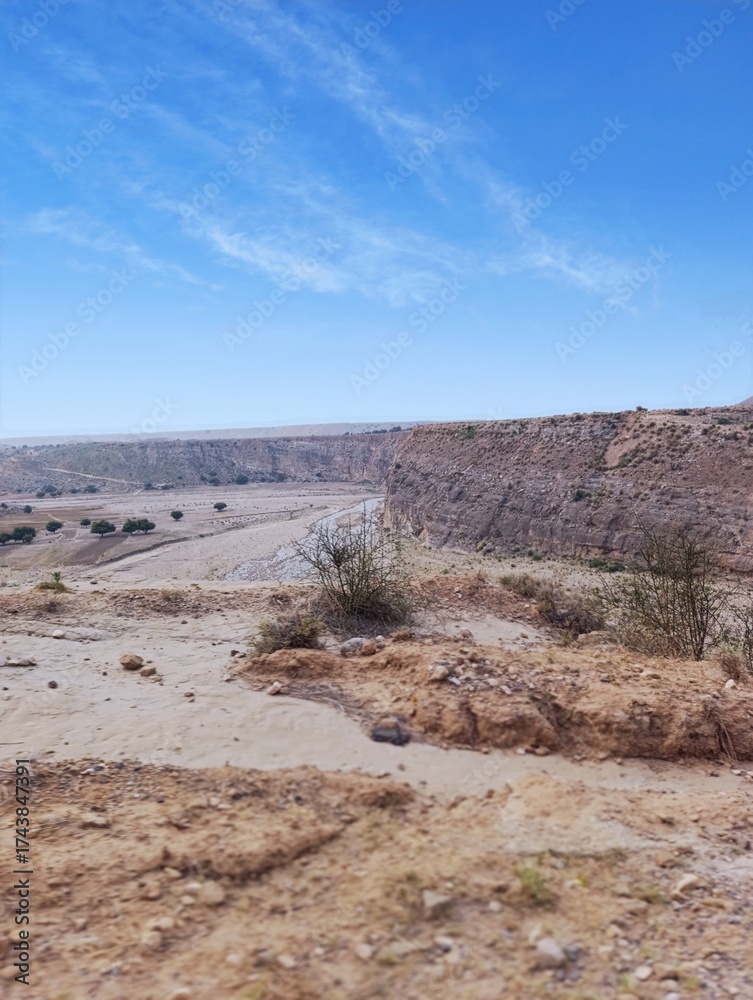 Dry riverbed and mountain valley terrain in Barthi, Koh e Sulaiman, Pakistan under clear blue sky showing geological layers, arid landscape, and natural rocky beauty of the Sulaiman Range