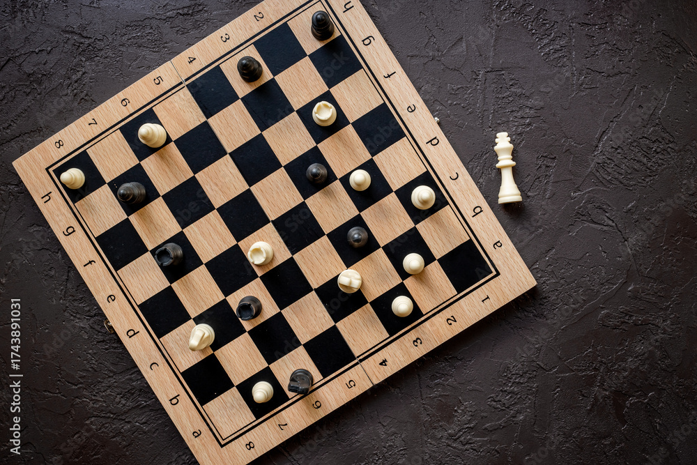King chess piece lying down near chessboard after checkmate during the game, top view