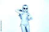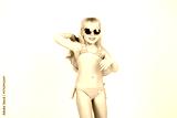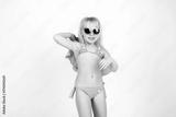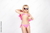 Beautiful teen girl dancing dressed in swimsuit, on white background