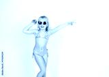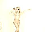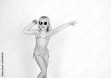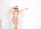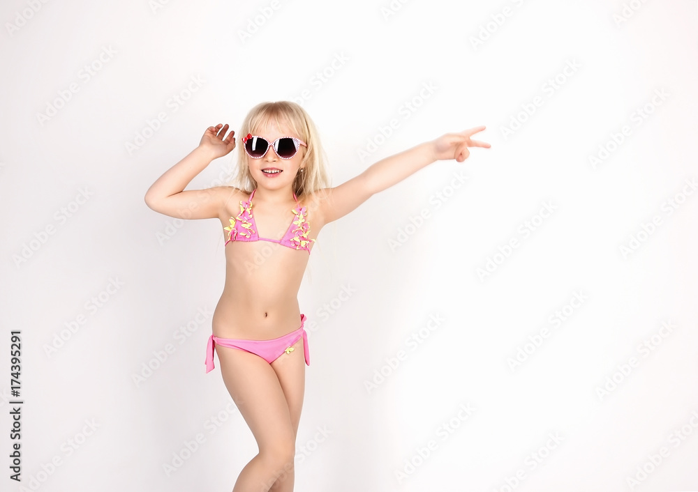 Beautiful teen girl dancing dressed in swimsuit, on white background