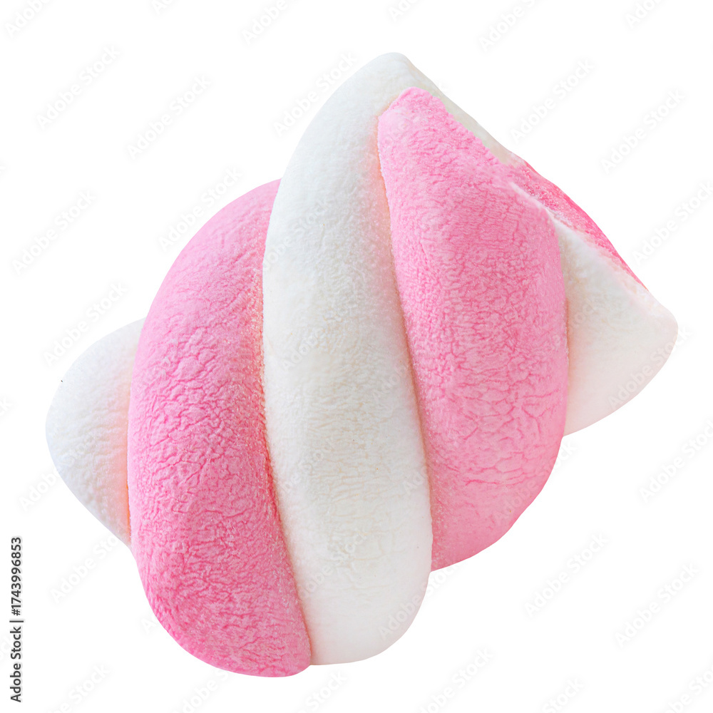 Flying one Marshmallow candy isolated on white. High-Quality Levitating Marshmallow. Twisted colorful marshmallow Top view. Flat lay.