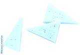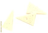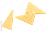 Flying Emmental cheese triangle isolated on white background. Levitating maasdam cheese piece. Top view. Flat lay
