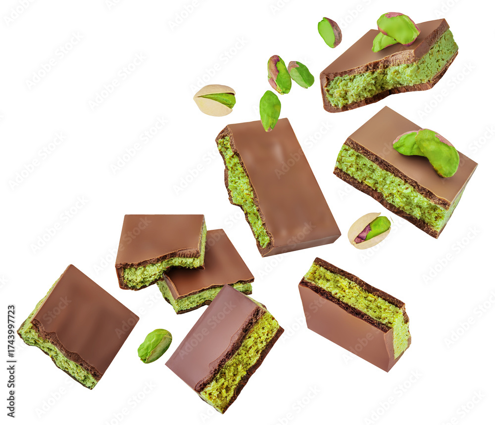 Flying Dubai Chocolate isolated on white background. Chocolate filled with green pistachio paste and kadayif. Levitaing trendy Dubai Chocolate