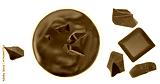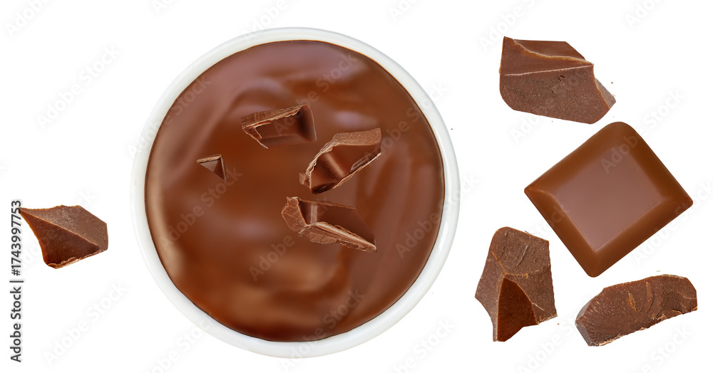 Chocolate cream in bowl isolated on white background. High-Quality Melted chocolate and chocolate bar pieces top view. Chocolate spread Flat lay