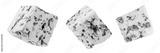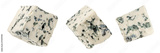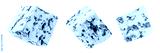 Blue cheese isolated on white background. Mold cheese with spores falling in the air. Flying green cheese collection . Pattern