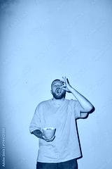 Caucasian young adult man eating snacks from bowl, standing against plain blue background, looking upward while holding food near mouth, displaying casual body language