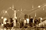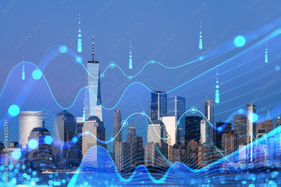 Digital data wave overlay on downtown Manhattan skyline in NYC under clear blue sky showcasing financial district and technology concept..