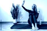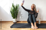 Selfie, woman and home with fitness break for social media post, photography or memory in lounge. Health blog, exercise influencer and person in house for content creation with smile for picture.