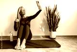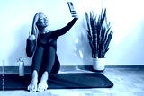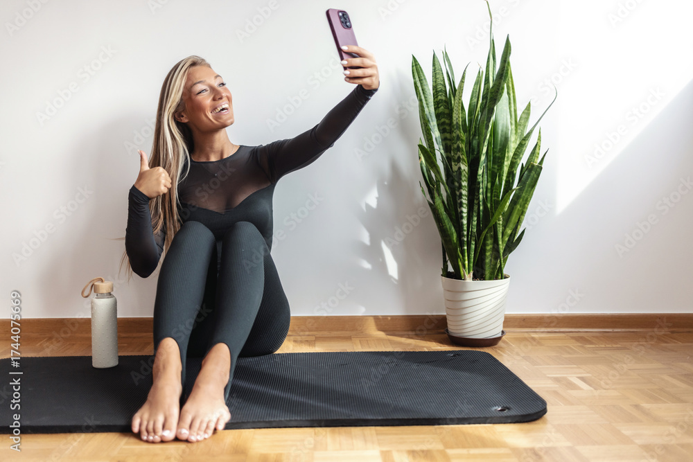 Selfie, woman and home with fitness break for social media post, photography or memory in lounge. Health blog, exercise influencer and person in house for content creation with smile for picture.