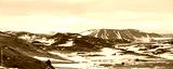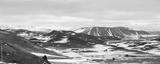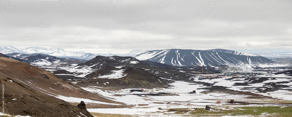 mountain landscape with snow covered mountains with the crater of Hverfjall, Lake Mývatn, Iceland
