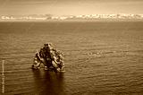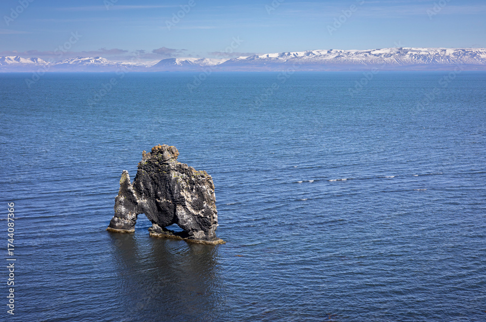 the view of Hvitserkur rock basalt sea stack from the coastline cliffs, Vatnsnes Peninsula, North Iceland