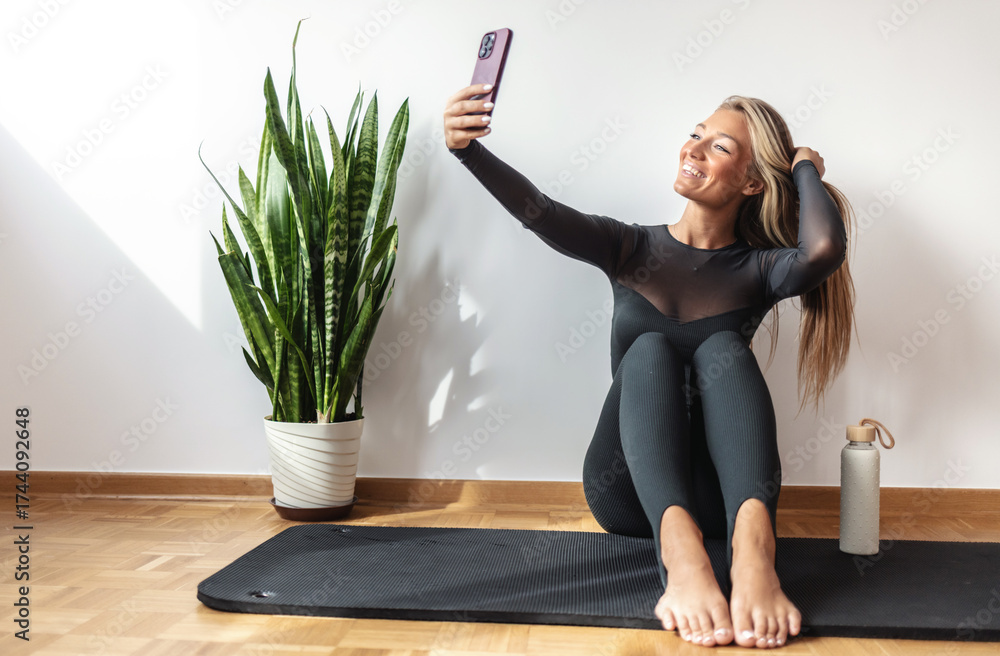 Fitness, selfie and yoga with happy woman in living room of home for health, pilates or wellness routine. Exercise, holistic and smile with Indian person on floor of apartment for social media.