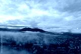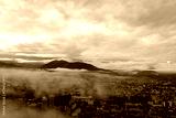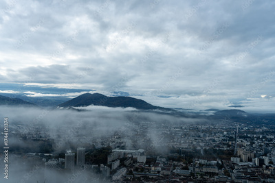 Panoramic view of Grenoble from the surrounding mountains, showcasing the city nestled in the valley with the Alps rising majestically in the background under clear natural light.