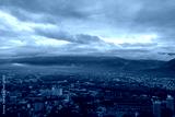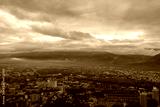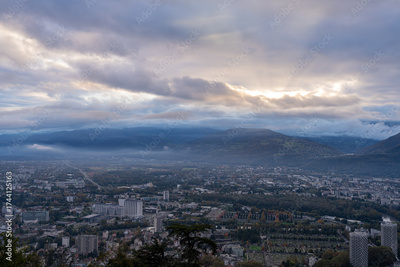 Panoramic view of Grenoble from the surrounding mountains, showcasing the city nestled in the valley with the Alps rising majestically in the background under clear natural light.