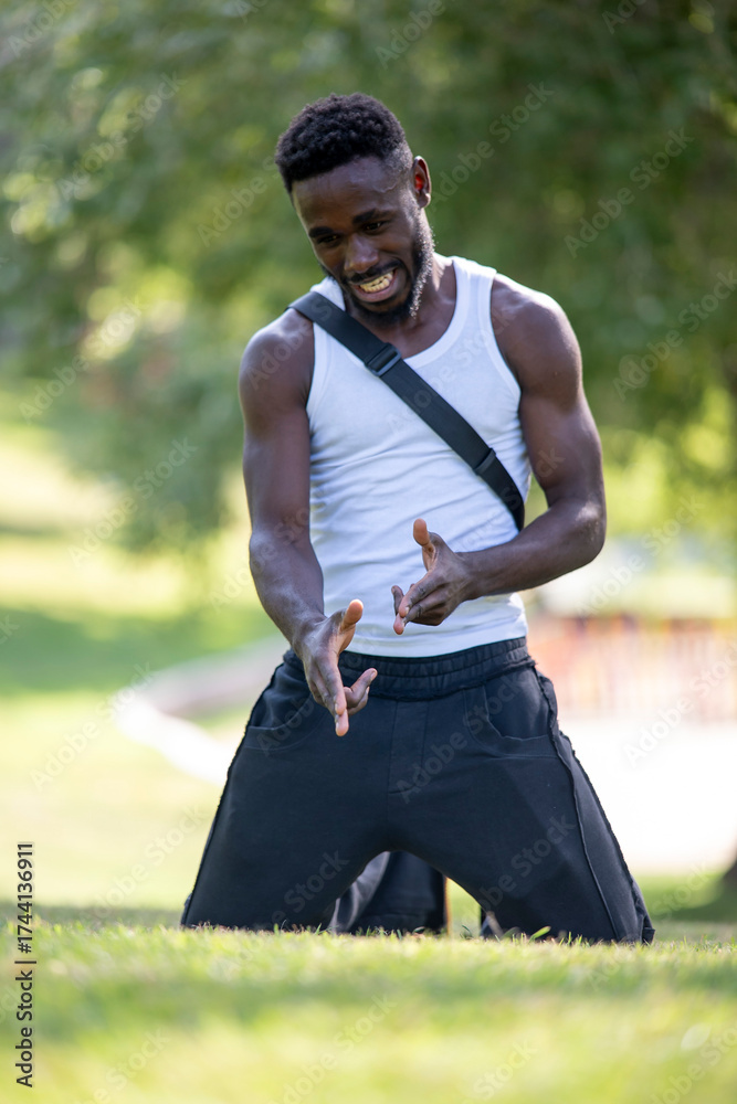 Playful young man smiling making expressive hand gestures outdoors during cheerful summer sunny afternoon