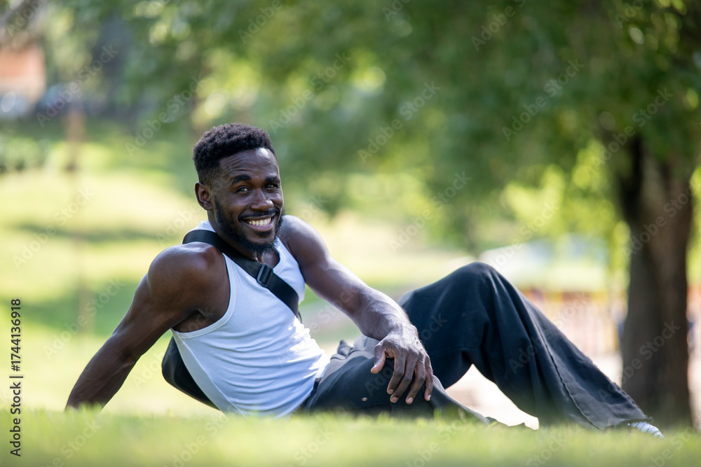 Relaxed young man smiling sitting on grass wearing casual outfit during warm outdoor summer afternoon