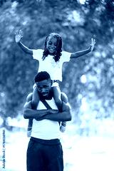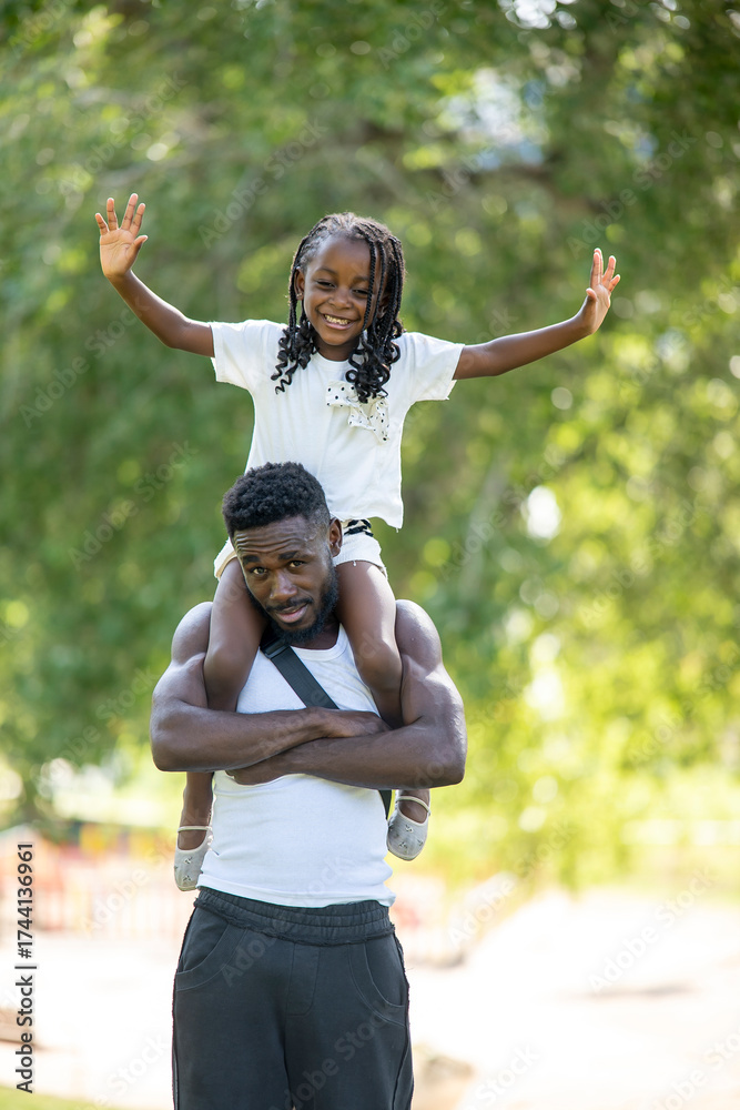 Happy girl raising arms sitting on father’s shoulders outdoors during joyful summer park afternoon