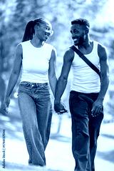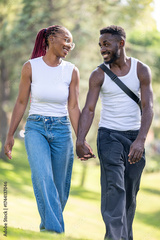 Romantic couple walking hand in hand smiling happily together in sunny green park