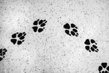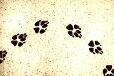 Paw print of a dog, wolf. animal tracks. Paw print on a gray background. black and white photography