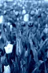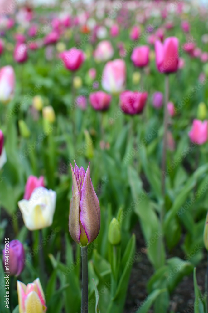 blooming pink tulips with fresh green leaves in the park. Dutch tulips bloom in spring.