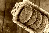 oatmeal cookies with nuts in a ceramic dish on a wooden table surface. confectionery.