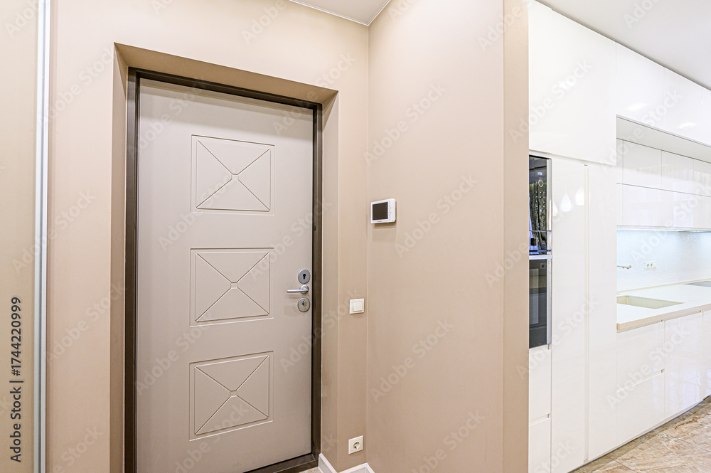 A well-lit hallway features a modern glass folding door and two paneled doors. Beige walls and patterned tile floor create a warm, inviting space