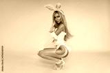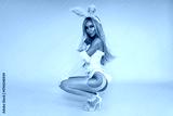 Beautiful woman in pink bunny Halloween costume posing on pastel background, glamorous sexy bunny girl outfit, festive Halloween fashion concept