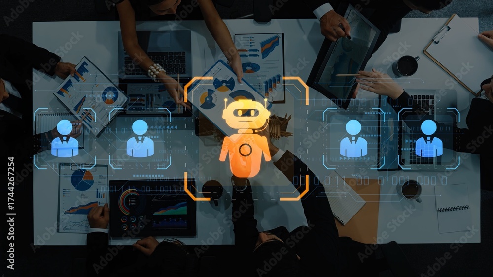 Dynamic digital workspace showcasing an AI assistant amid collaborative professionals utilizing analytics for business growth, enhancing productivity and decision-making. Raster