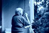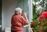 Elderly woman closing window in apartment.