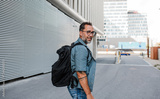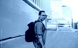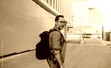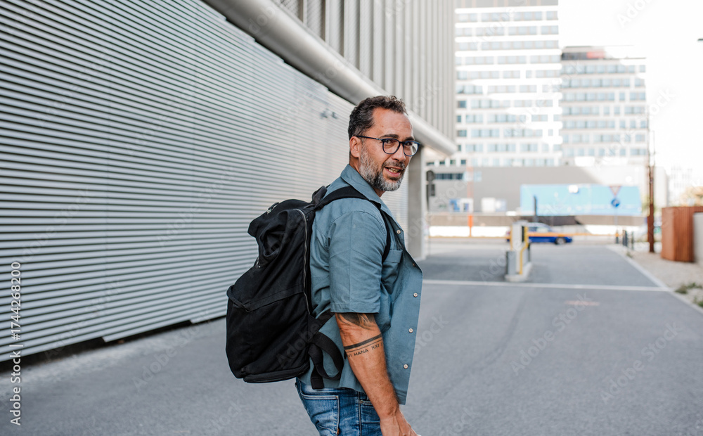 Handsome man with tattoos walking down the street.
