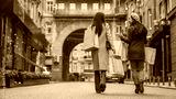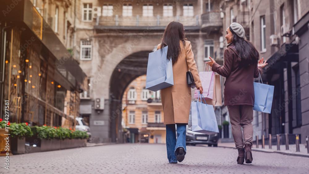 Rear view full length shot of female friends out for shopping in the city. Two girlfriends walking together with bags, buying clothes on black friday. Discounts and sales, copy space