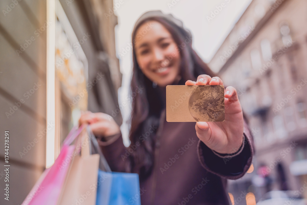 Asian girl woman with shopping bags and credit card for payment, discount or sale at retail store or mall, enjoying shopping outdoors at the city street. Black friday concept. E-banking e-commerce
