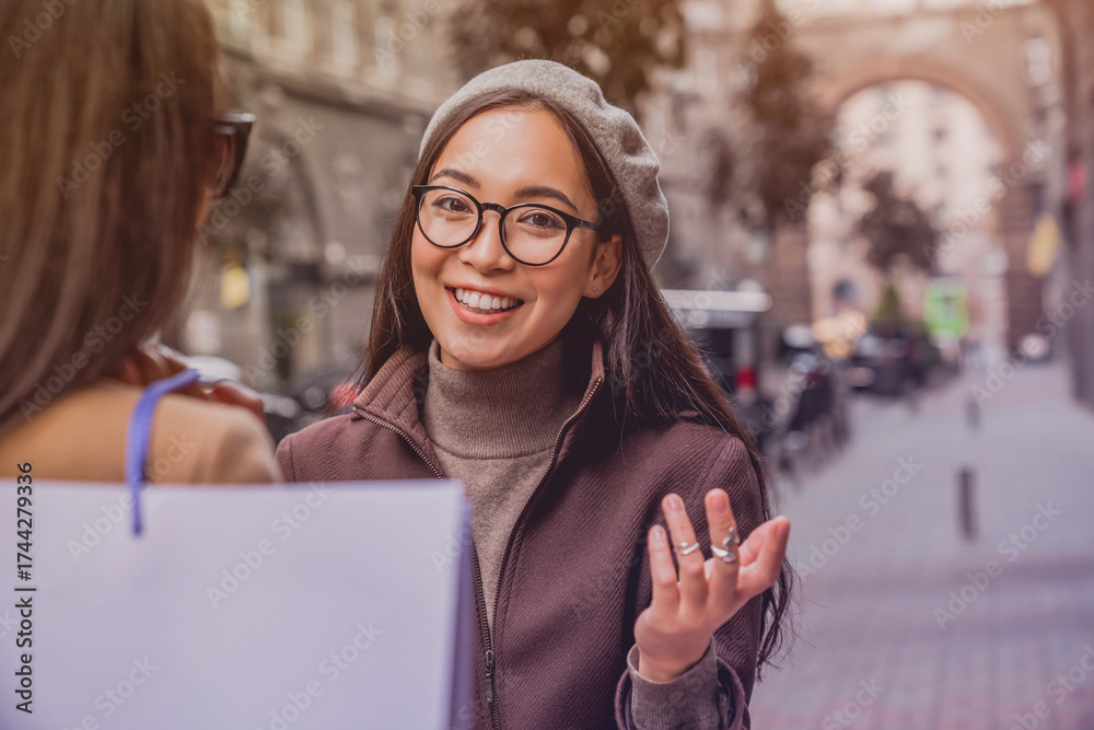 Smiling female shopper friends with shopping bags in hands walking outside of shopping mall and having fun. Happy fashionable girls walking near shop window at shopping mall with paper bags in hands.