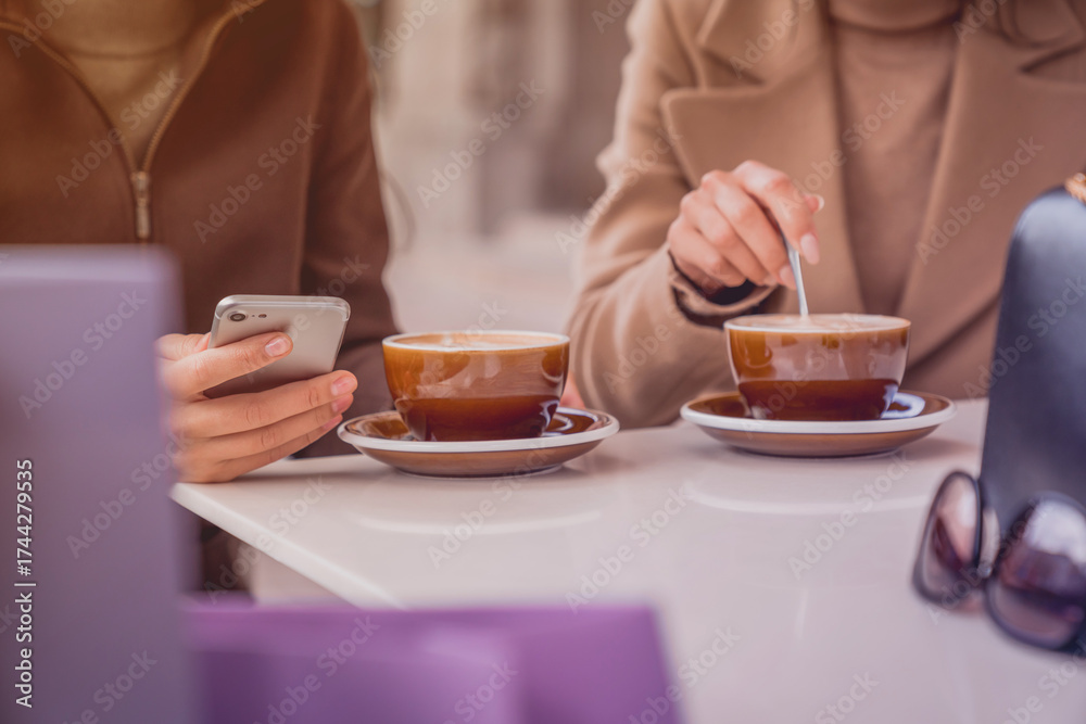 Friends, smile and chat in cafe, happy and listening to gossip, talking and laughing. Coffee shop, girls and hangout, conversation and coffee cappuccino for people with joy, close up