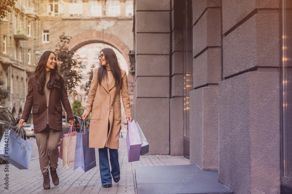 Full length of two young women walking on the city with shopping bags after buying clothes