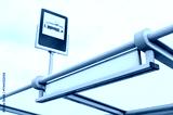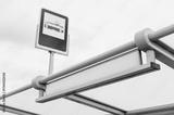 Public transport stop in a city under cloudy skies with a sign indicating tram service availability