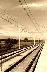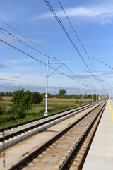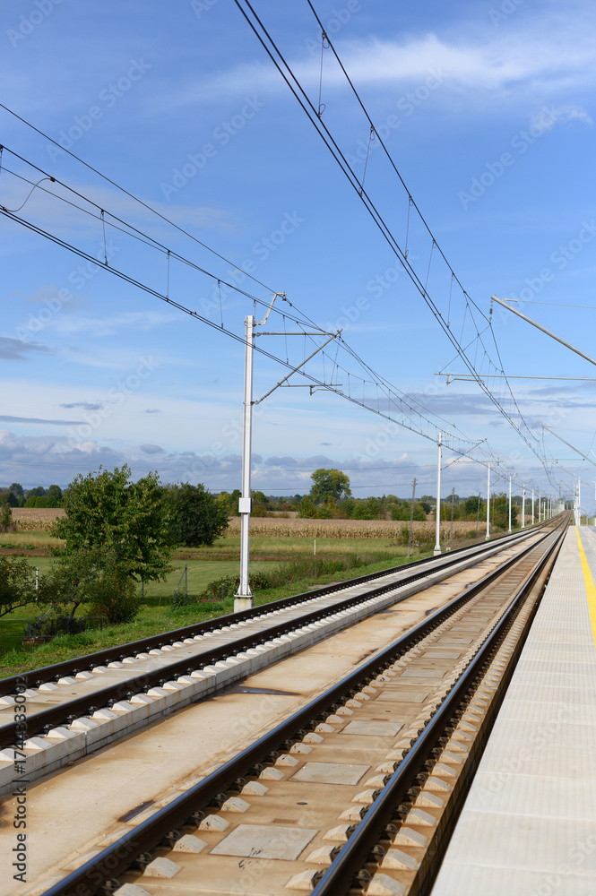 Train tracks stretching through a scenic landscape under a clear blue sky