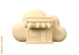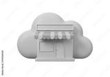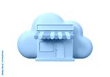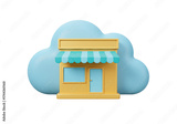 Cute yellow store isolated on transparent background PNG, 3D shop with blue awning and cloud for online business and e-commerce
