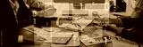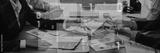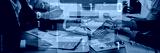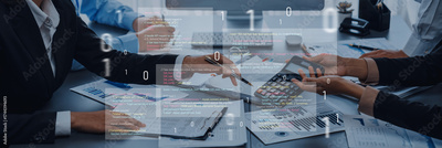 Professionals engage in a business meeting, discussing statistics and technology, with data overlays enhancing the analysis in a modern office environment. Trope