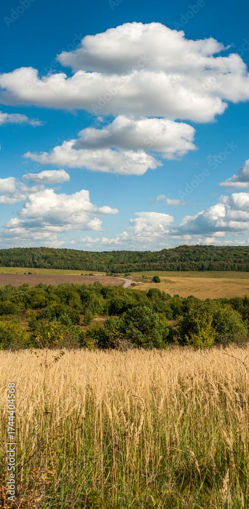 view from dry grasses, road, fields and forest at horizon, blue sky with clouds