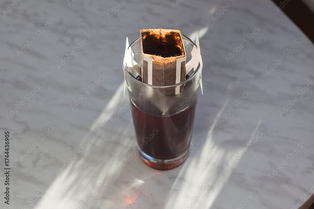 Drip bag in glass cup. Instant freshly brewed alternative filter drink in mug with shadows. Easy brew black coffee method for home, travel or office. cozy trendy lifestyle, sunny day