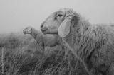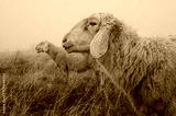 Description: A close-up profile of a white, woolly sheep with another out-of-focus sheep in the background, standing in a field of dry, tall brown grass on a foggy day.