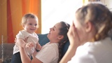 a small child is held in his arms. happy and full of joy childhood, children's dream concept. family resting at home, mother and older sister lift lifestyle a little boy in their arms