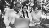 Excited international students studying in park, enjoying the results of their job, looking at laptop screen and smiling, sitting together on bench in campus