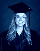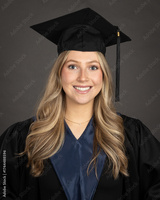 young female graduate with blonde hair wearing cap and gown, isolated on grey background
