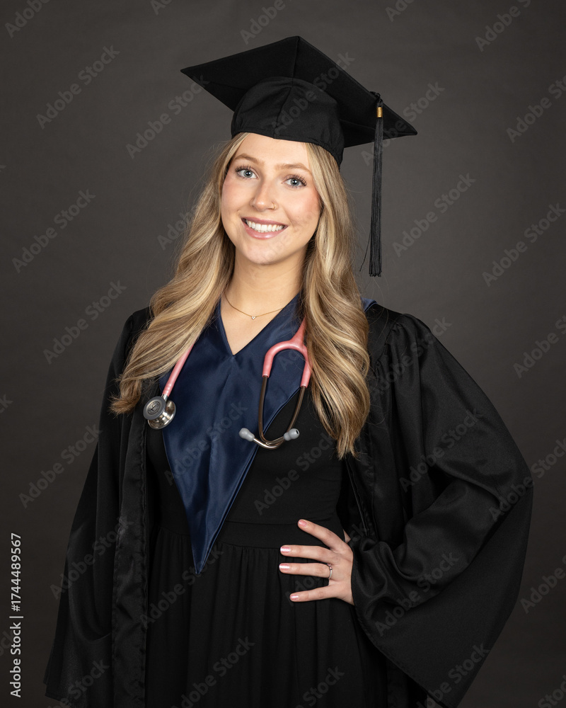 portrait of a young blonde female graduate wearing cap and gown isolated on grey background